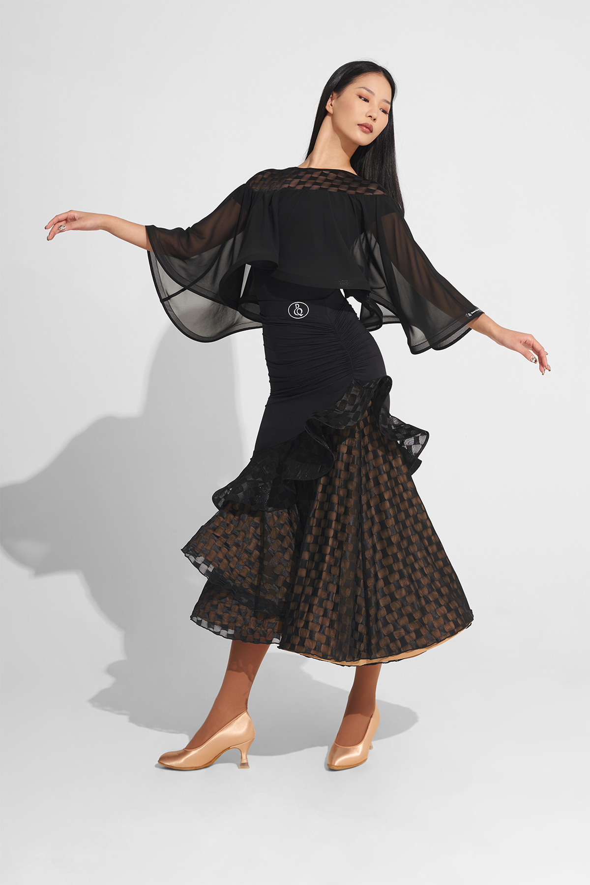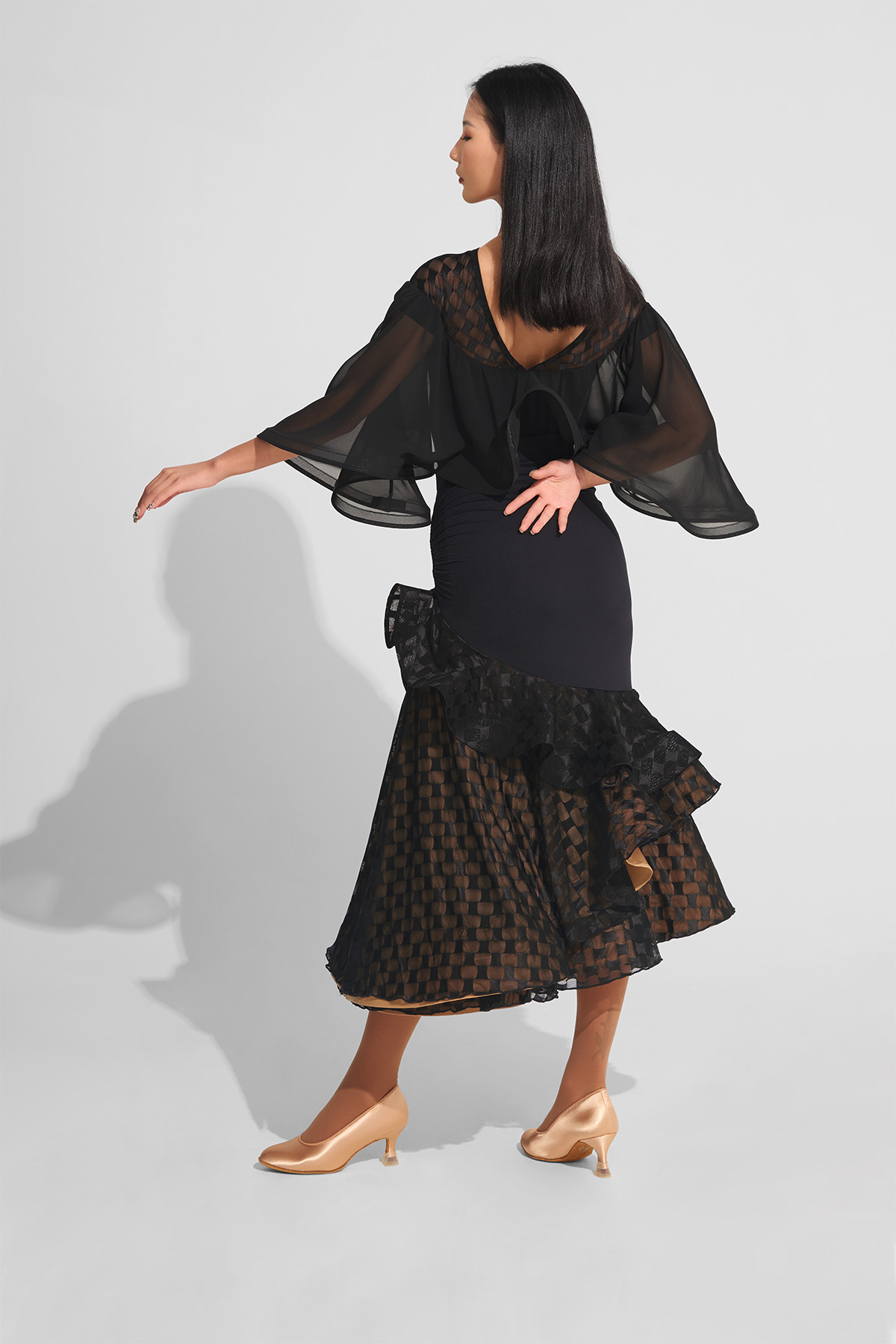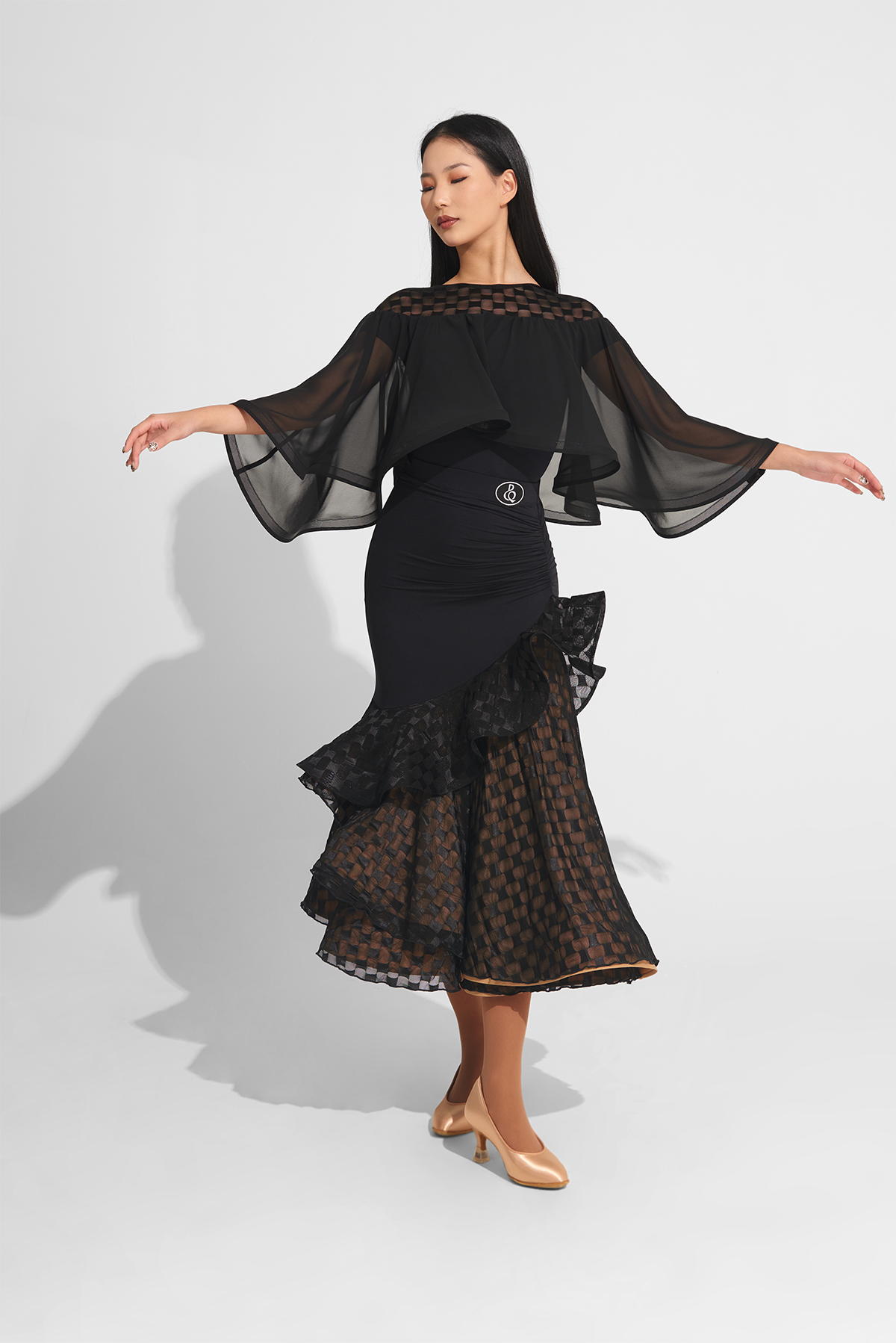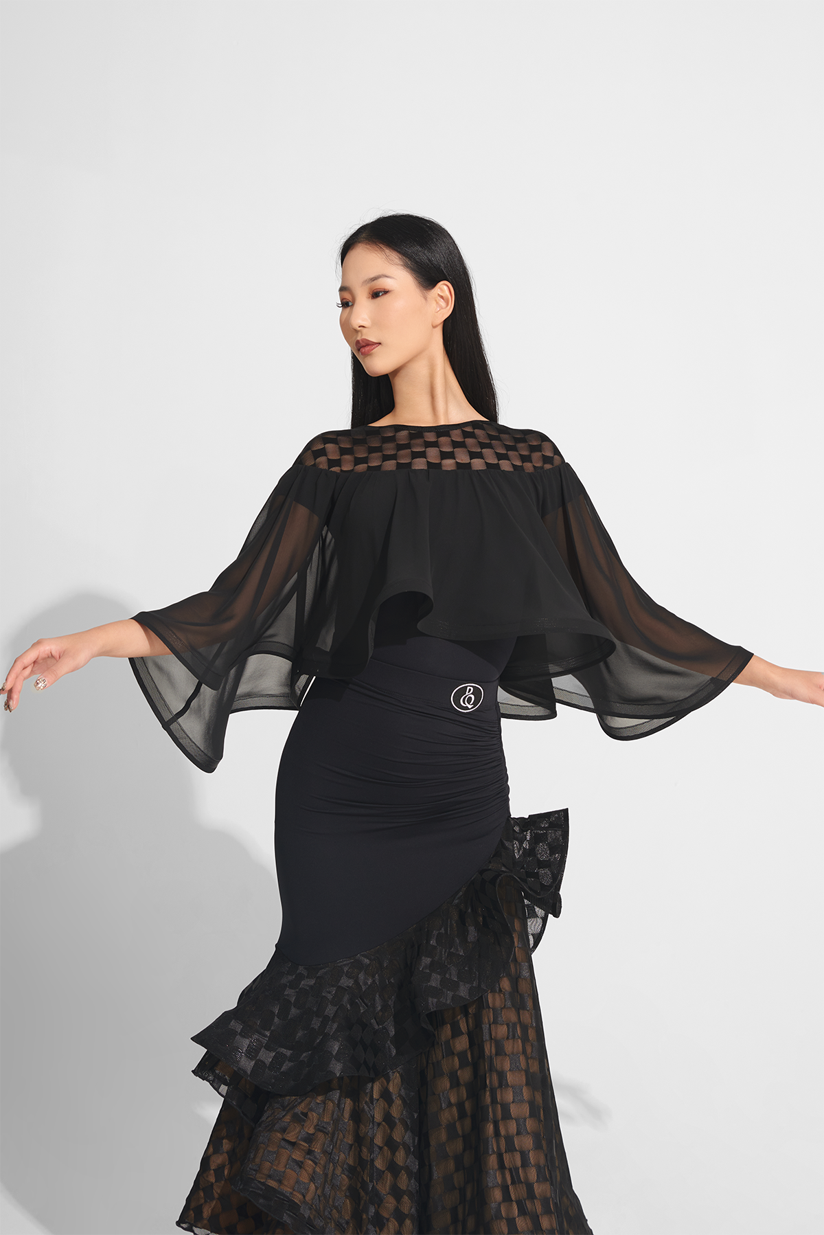 短い袖の上に纏うジョーゼットのケープが上品に二の腕をカバーし、シックな装いを演出します。