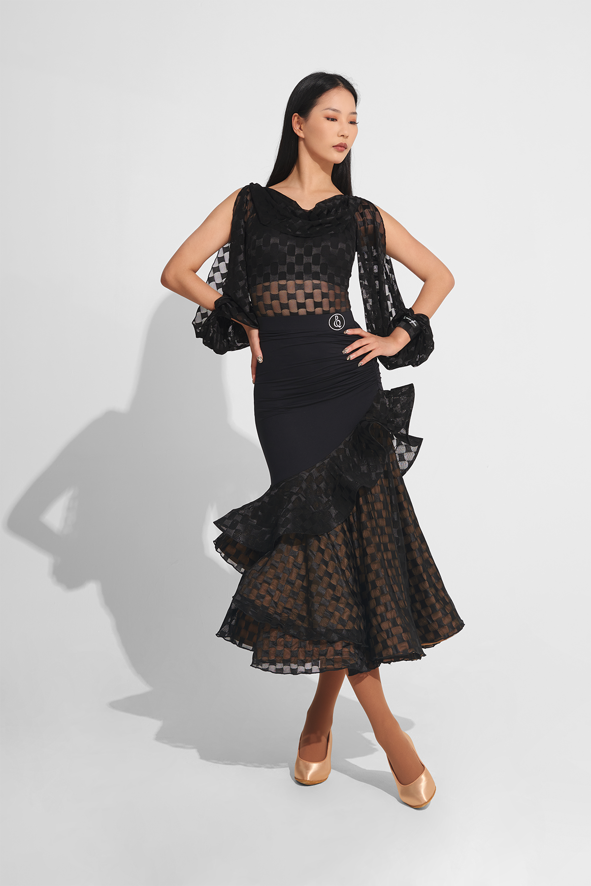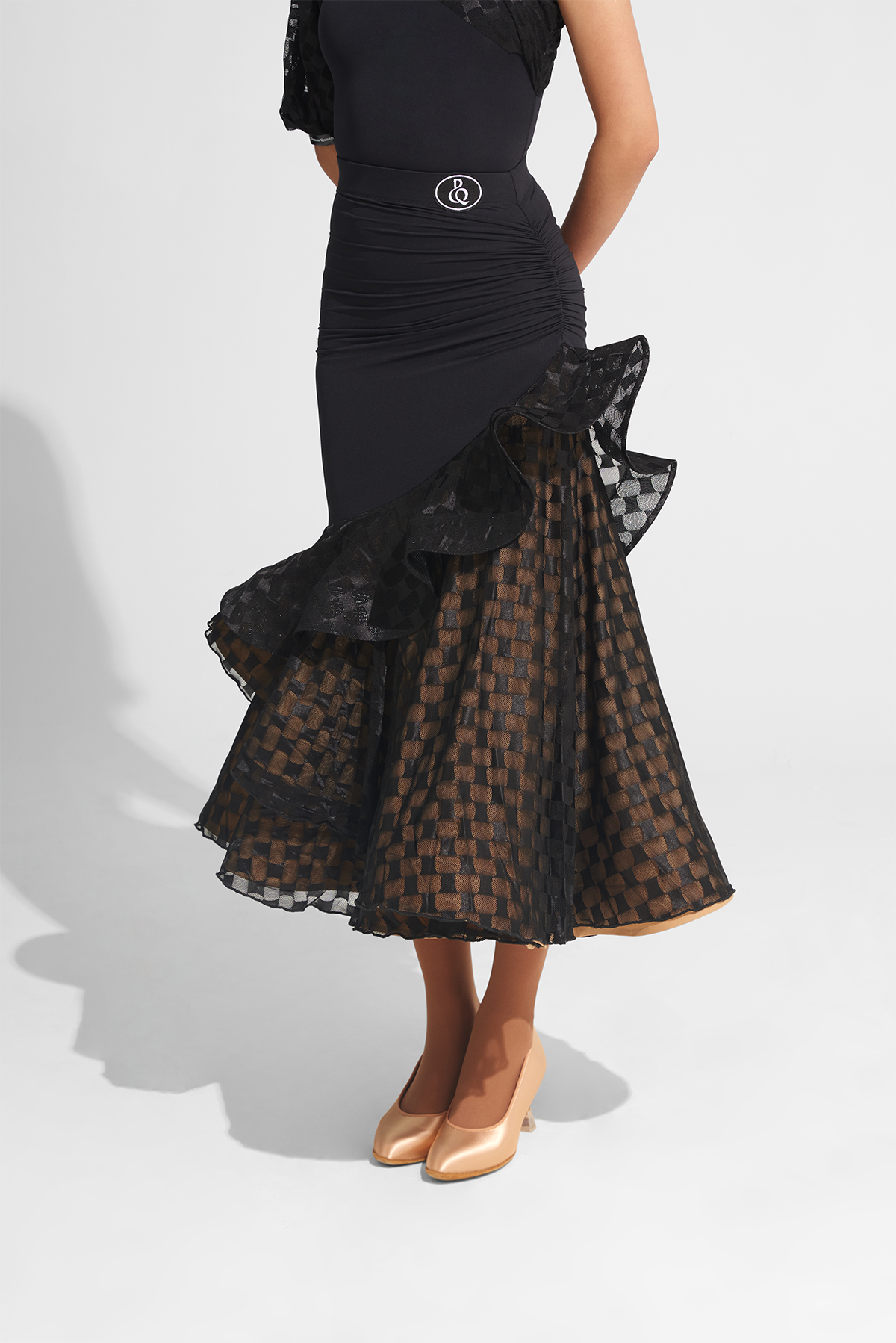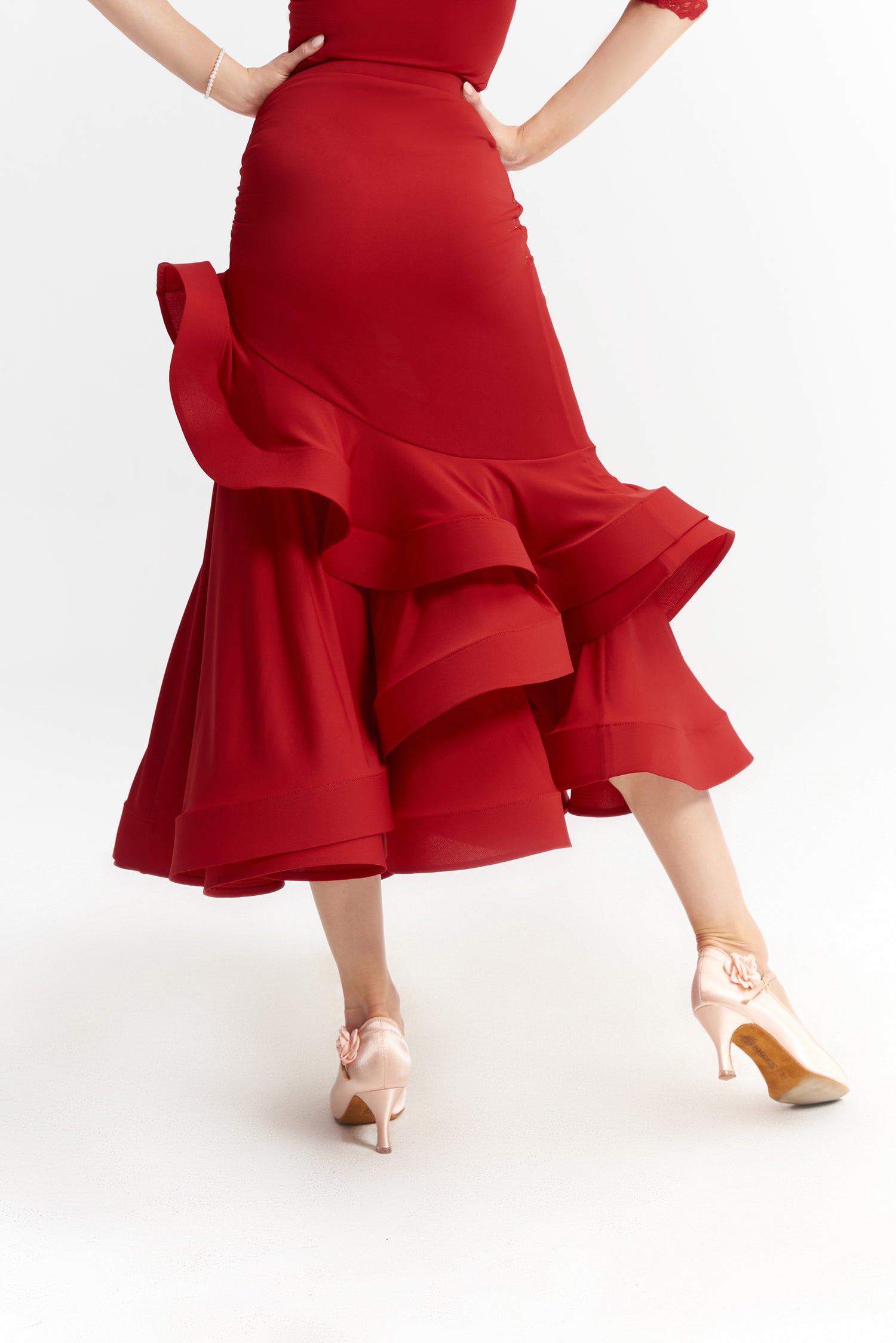 大胆にあしらわれた大きなフリルが抜群に目を惹く人気のボールルームスカートです。