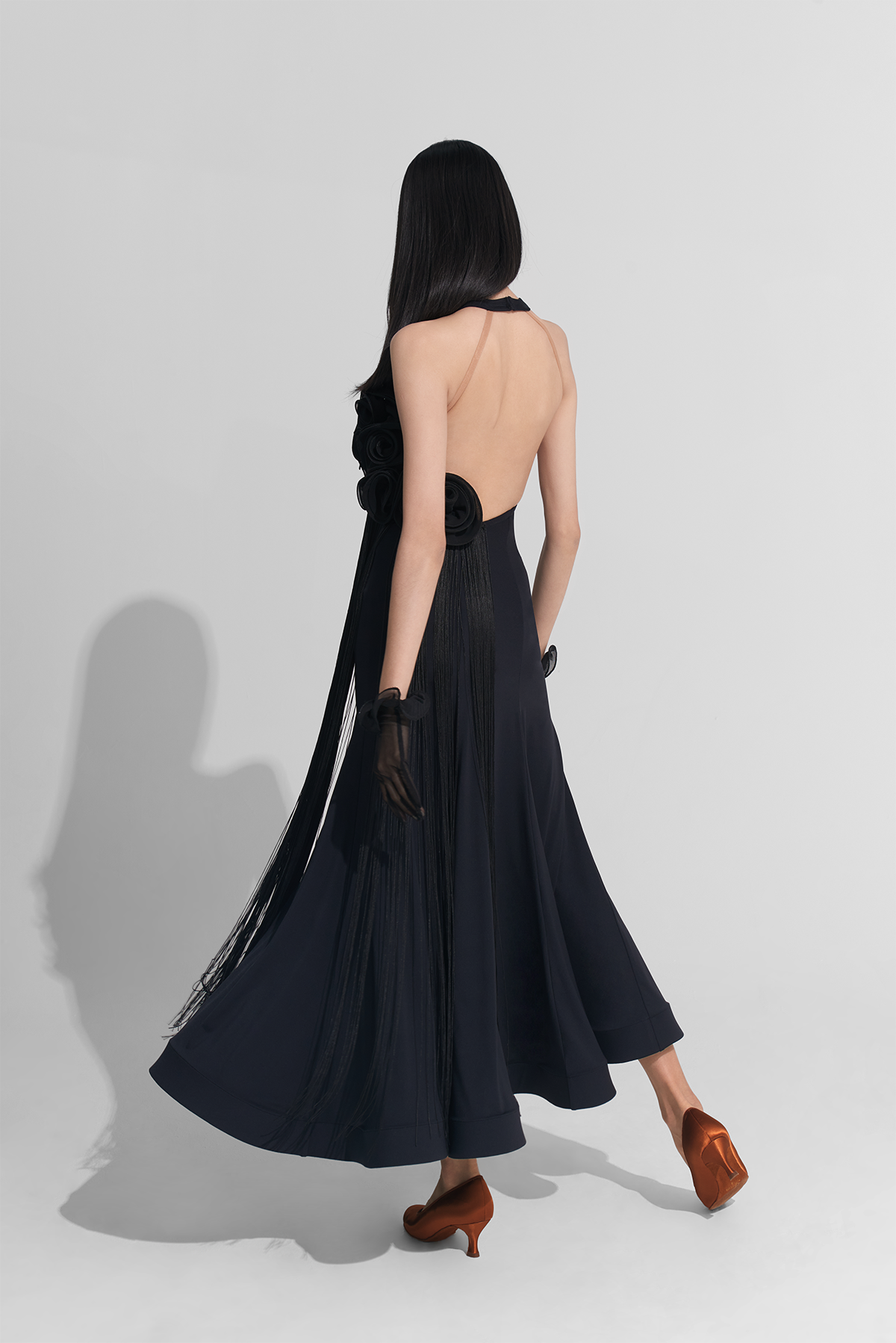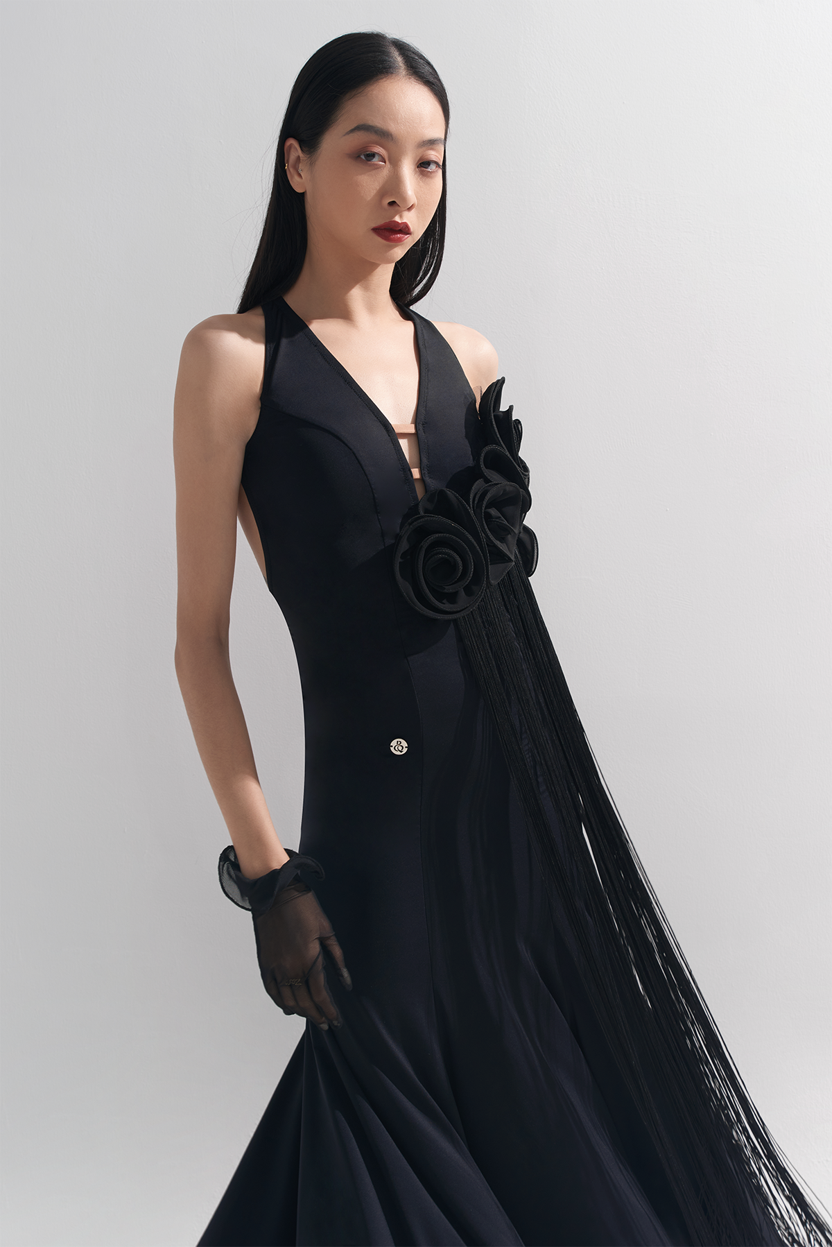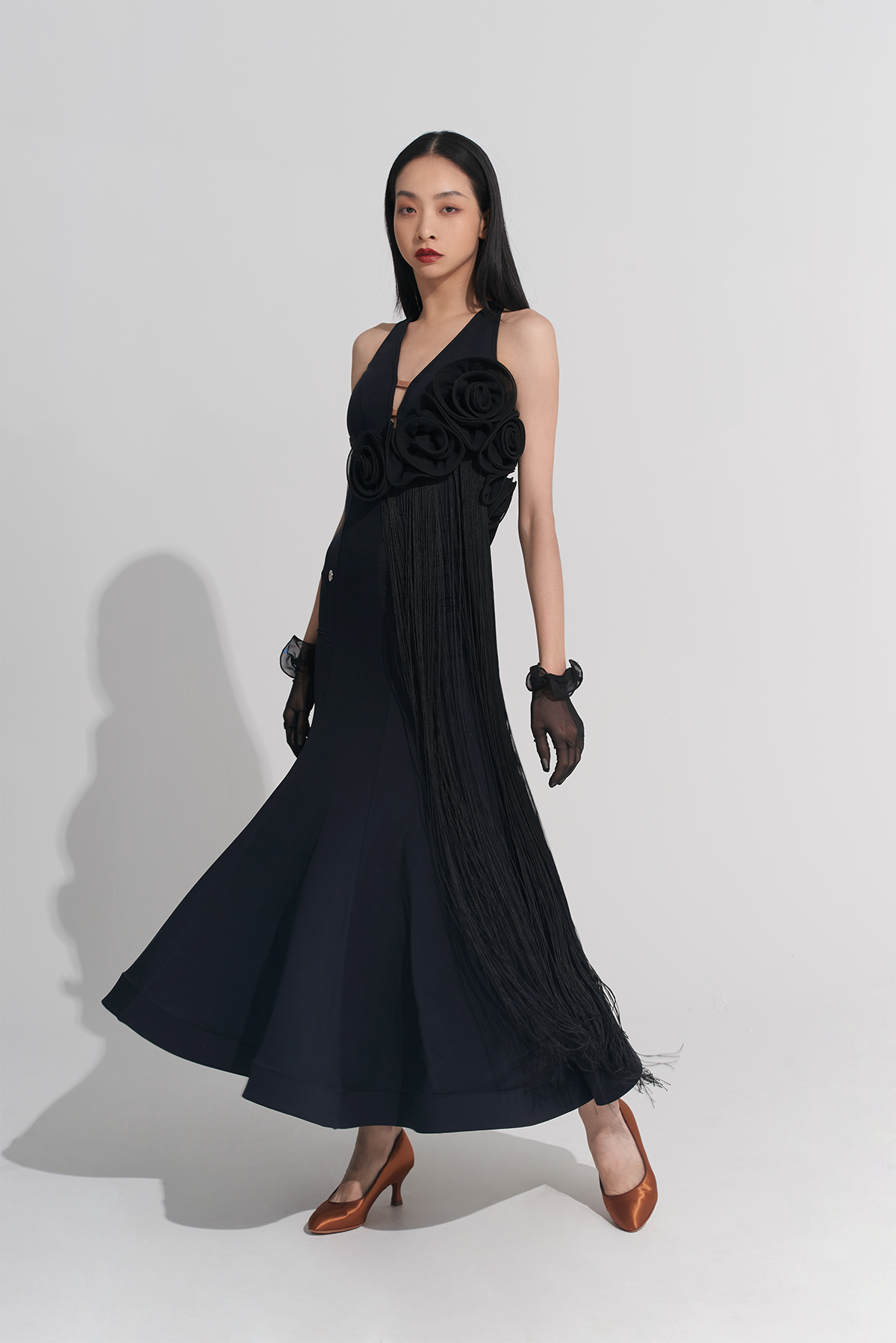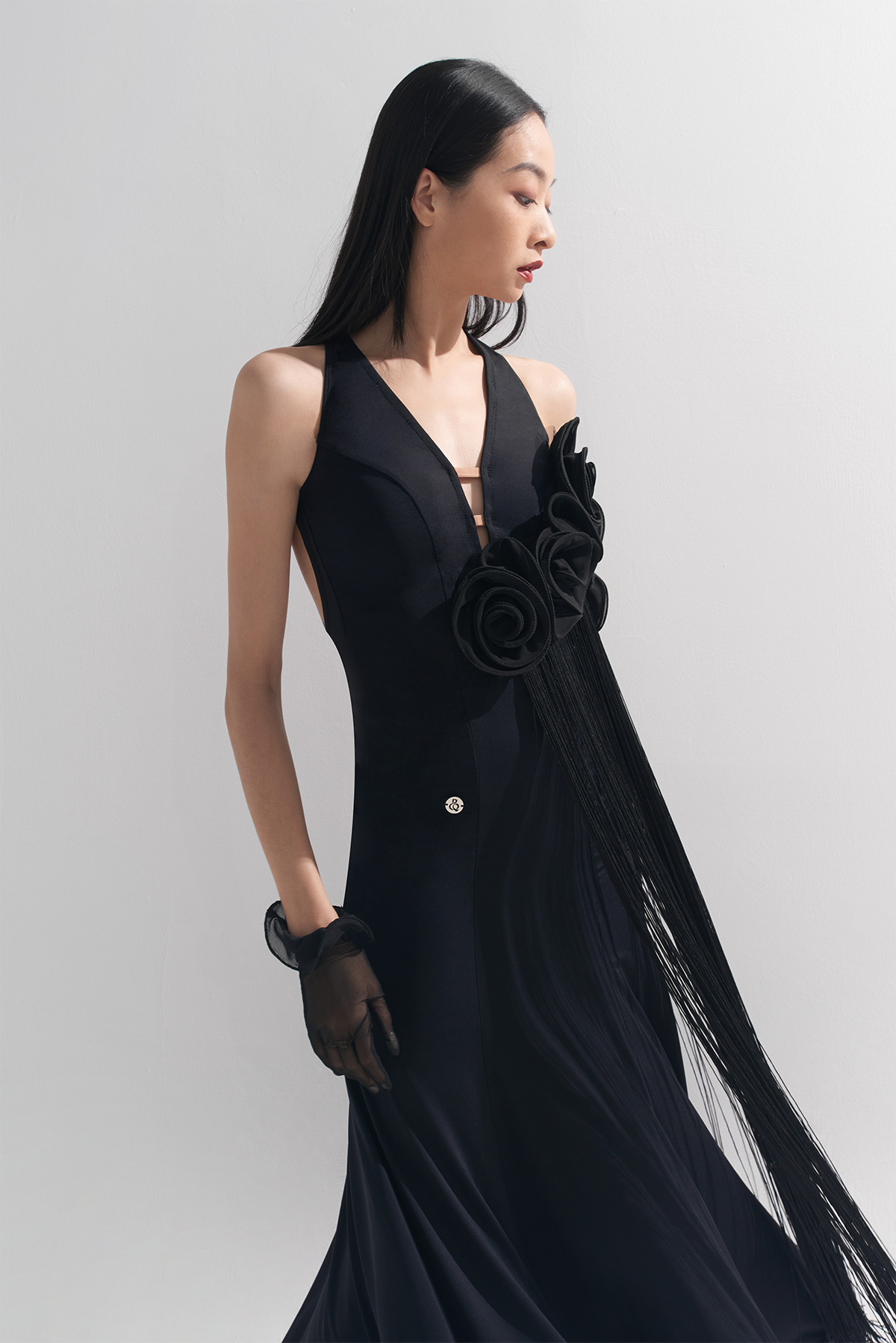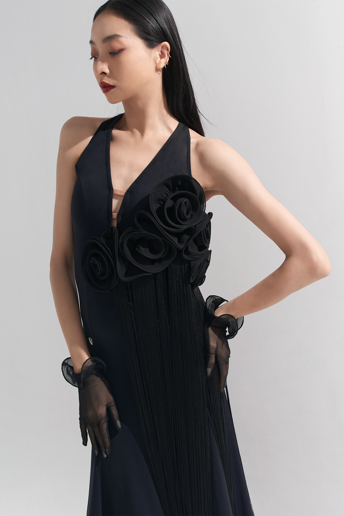 たっぷりの立体フラワーモチーフと、胸下から裾まで伸びるロングフリンジが印象的なワンピースです。