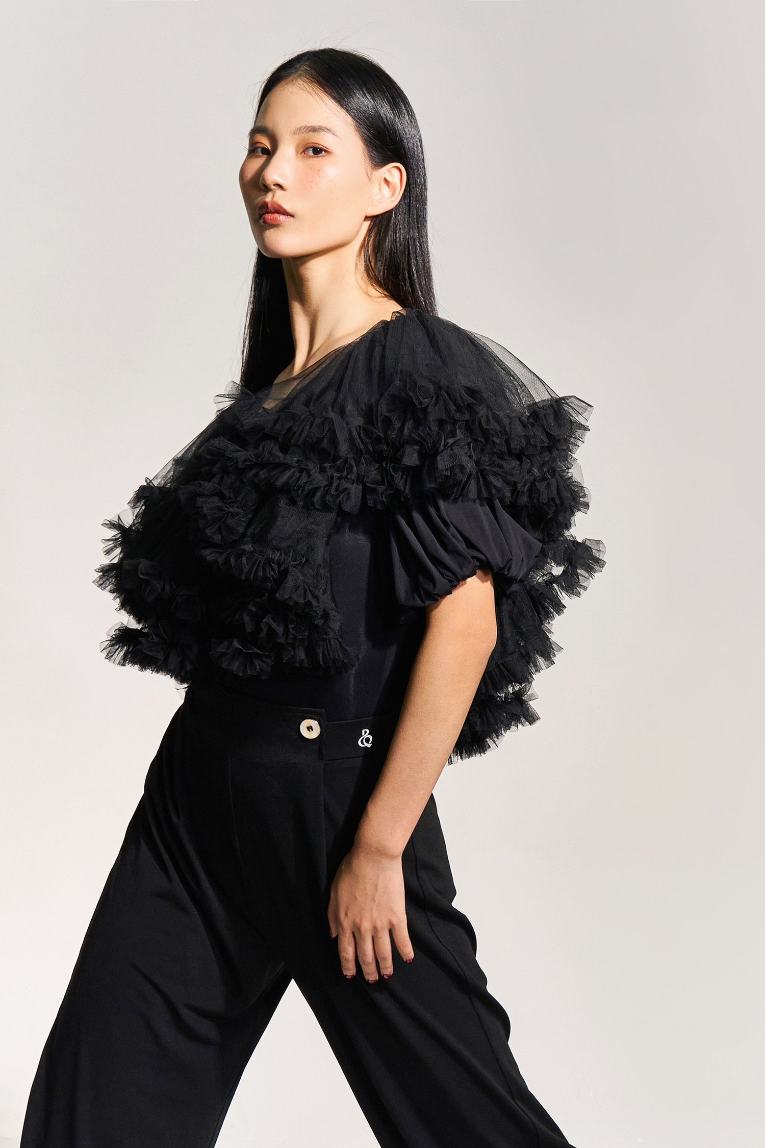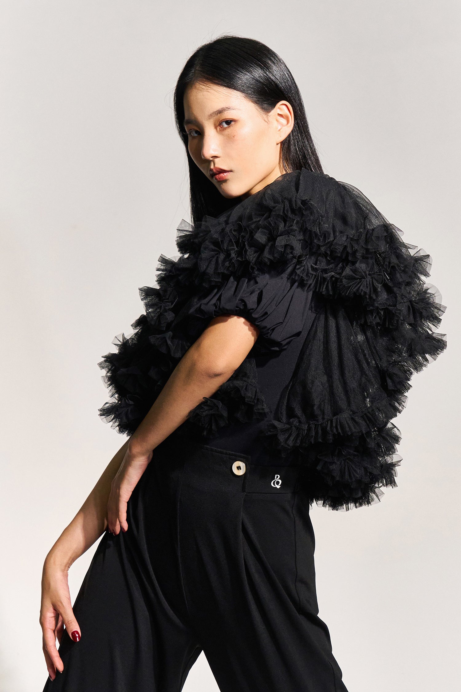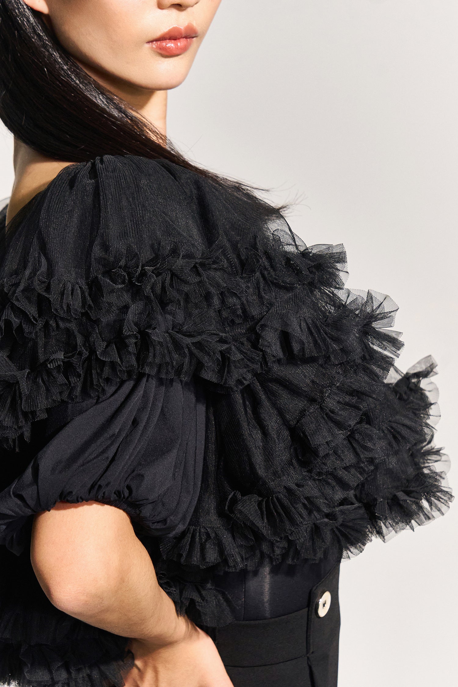 ギャザーを寄せたチュールをたっぷりと使用した贅沢な1着です。ボリュームはありますが生地の透け感が軽さを演出し、モードな魅力が溢れます。
